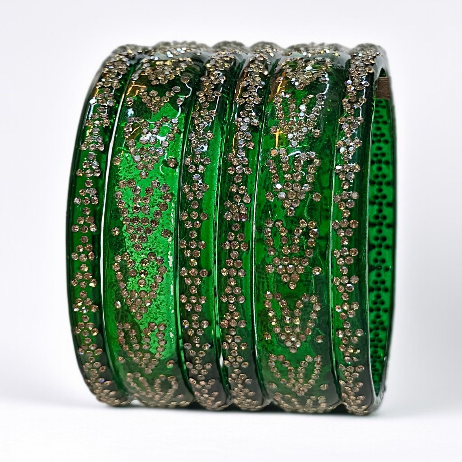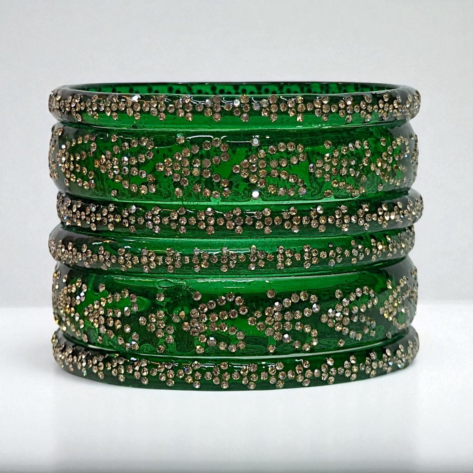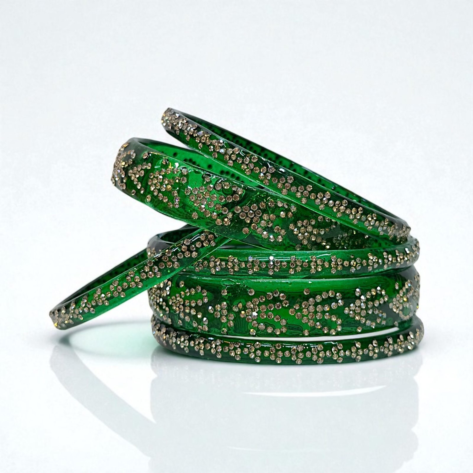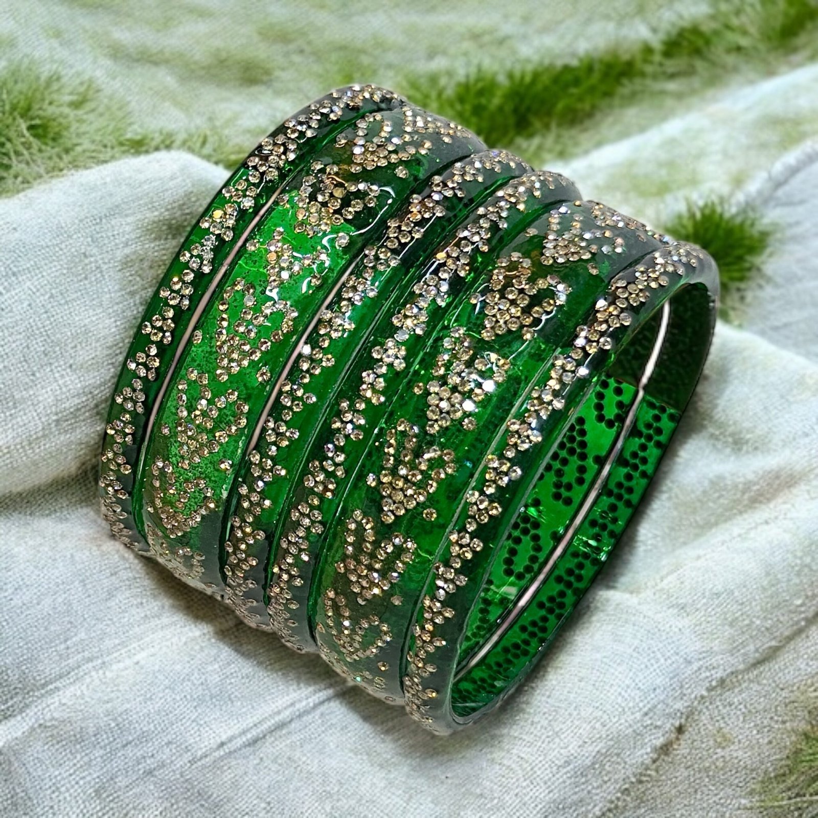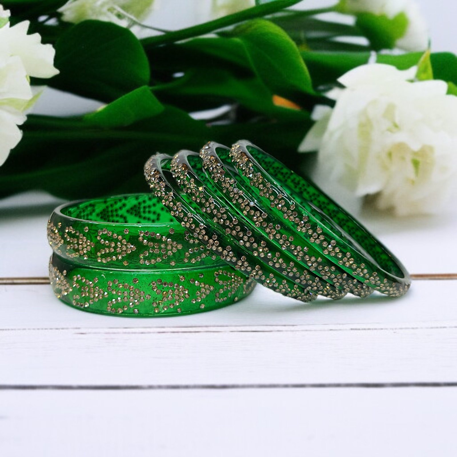 Elegant green glass bangles adorned with intricate heart-shaped pattern and sparkling rhinestone work bangles set