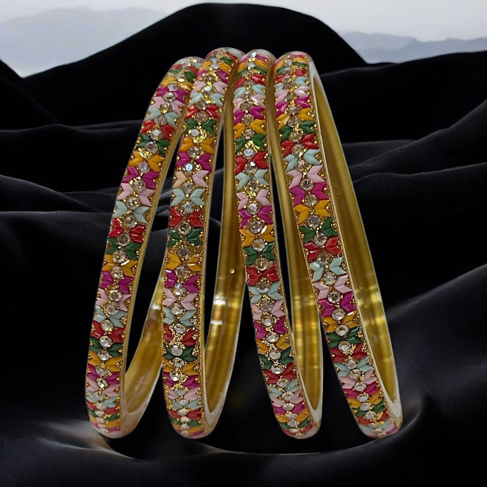 DESIGN ELEMENTS: Exquisite multicoloured crystal-studded glass bangles featuring intricate patterns with pink, green, red, and yellow stones on gold-toned base