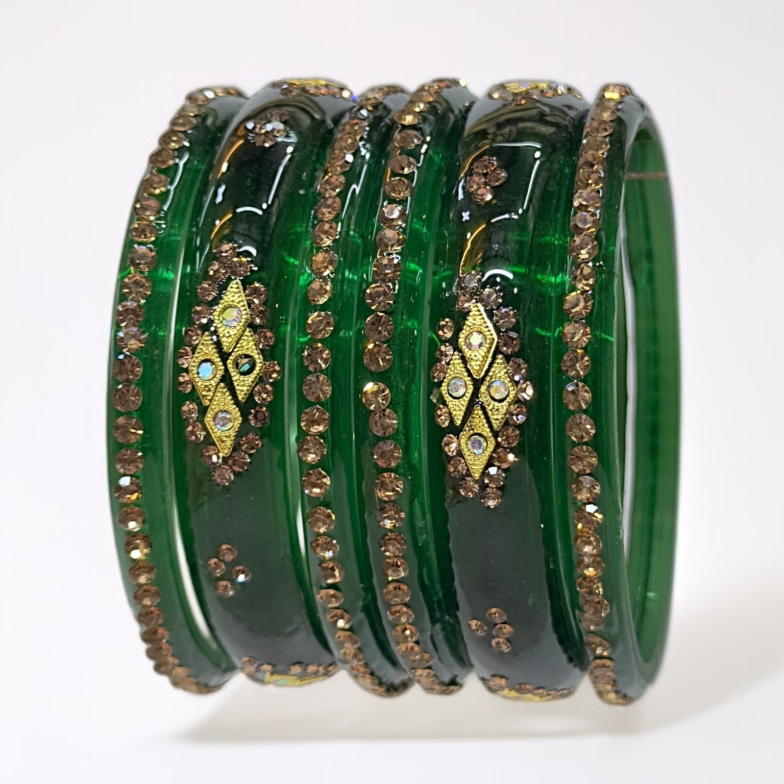 - Material:- Glass | Stone:- Zircon Gemstone | Color:- DarkGreen | Pack of 6 Bangles wIth Plastic Box Packaging